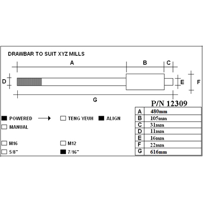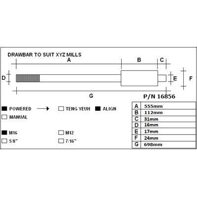Drawbar Teng Yueh R8, 7/16", 601mm long to suit SMX / RMX 2500